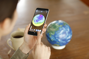 「ほぼ日のアースボール」は、スマホやタブレットをかざして地球の「今」だったり世界のいろんな情報がとびだす国境も国名もない地球儀。