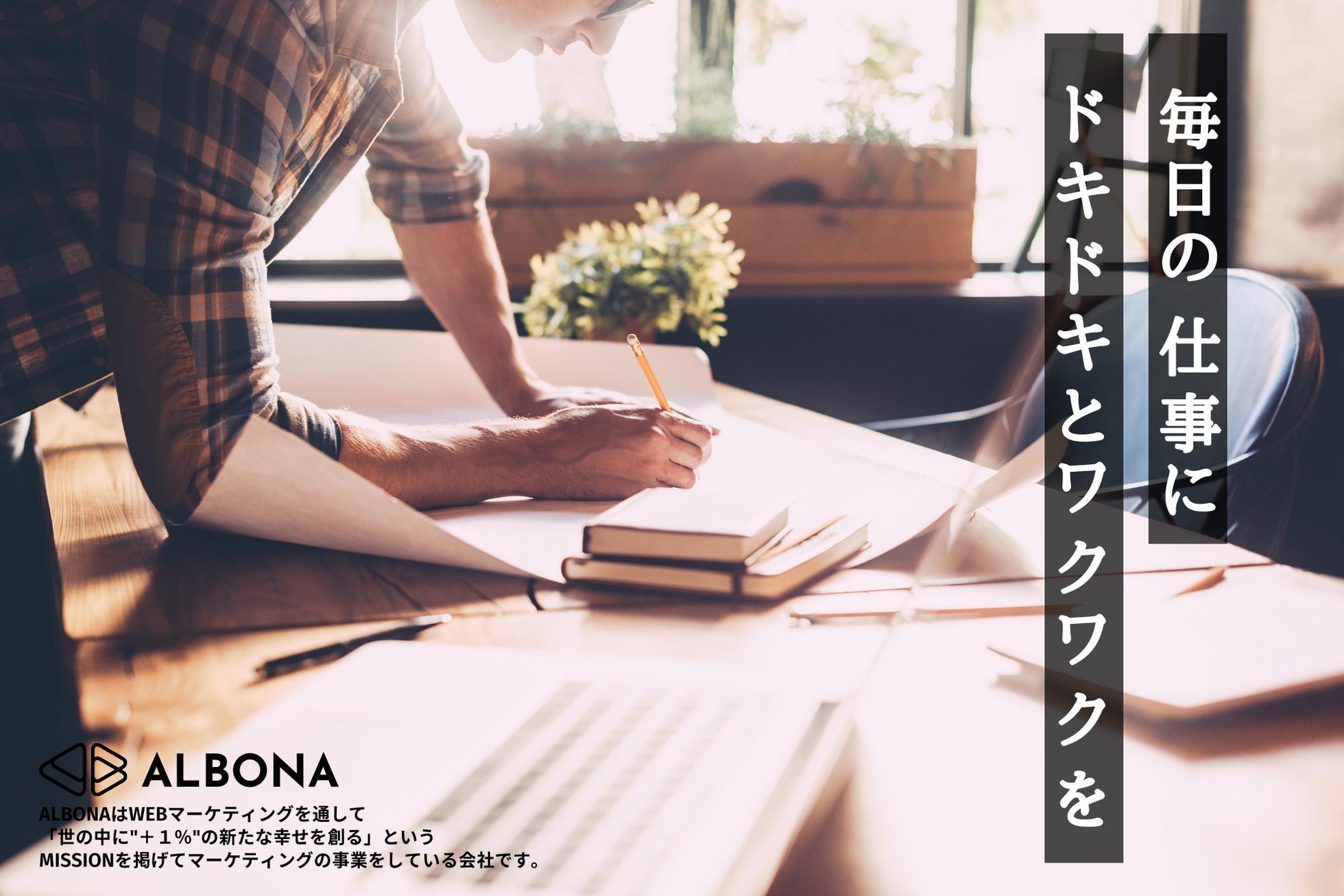 ALBONAはWEBマーケティングを駆使して 「世の中に"+1%"の新たな幸せを創る」 というMISSIONを掲げて、マーケティング事業をしている会社です。 - 主な業務内容は? ■ 広告運用業務 さまざまな業界のWEB広告運用を担当。広告効果向上のための運用・分析・施策立案・改善実行・効果検証などを行ないます。 ◇ 市場調査 他社の広告やプロモーションの流行をチェック。トレンドワードなどの情報収集を行います。 ◇ クリエイティブや記事の作成 ライターやデザイナーと連携し、ターゲットにぶっ刺さるコピーや記事・動画や画像を作成します。 ◇ 分析・効果改善 運用開始後、広告効果を確認、分析と改善を行なっていきます。 ■ SNSメディア運営業務 Instagramを始め、TwitterやTikTok、You Tubeなど様々なSNS媒体の運用を担当します。バズを生み出し、フォロワー総数100万人以上のアカウントを裏方で運用します。 ◇ 各種媒体のアルゴリズムの分析 どの媒体がどういうロジックで投稿がバズるのか?を分析します ◇ 流行のチェック〜制作、運用 世の中の流行の美容やファッション、漫画や恋愛ネタ、転職や時事ネタなど様々なジャンルの情報収集をもとにコンテンツを企画から制作、運用まで担当します。 ■ インフルエンサーPR企画業務 InstagramやTwitter、TikTok、You Tubeなど提携しているインフルエンサーは1,000名以上!クライアントのニーズに合わせて適切なインフルエンサーを選定し、最適な企画を立案してバズを生み出し流行りを作ります。 ◇ アサインおよびスケジュール・タスク管理 クライアントのニーズに合わせた適切な媒体の選定から実際のインフルエンサーのアサイン、タスク管理を実行します。 ◇ PR企画の立案から実行から分析・効果改善 インフルエンサーに合わせた実際のPRの企画立案から実行まで実施。 運用開始後、広告の効果を適宜確認し、分析と改善を行なっていきます。 これからマーケティング業務の4軸にプラスして 自社でもどんどん事業を拡大しています。 ④新規事業開発 ■ C2C、B2Cプラットフォーム運営事業 ■ B2BのSaaS事業、ツール開発 ■ 生活消費財、美容領域のD2C事業(美容液シャンプー、ビタミンサプリを販売) ■ AIを活用したコンテンツ生成事業 マーケティング視点で幅広く自社事業を展開しています。 自社開発でWEBサービスや商品開発、アプリ開発など様々な事業をどんどん新しく作ります。 - 具体的にどんなコトをしているのか? 集客や販促に困っているクライアント様に対して 広告やSNS、インフルエンサーを活用した集客や販促をサポートしたり SNSの運用であったり、LPの改修を提案することでクライアント様のニーズを解決しています。 D2C企業やレガシーサービス、店舗運営の企業に対して多様なパターンでサポートしています。 取り組みのあるクライアント業界も多岐に渡ります。金融、不動産、美容、医療、ファッション、生活消費財、人材、食品など定期通販や来店申し込みなど幅広く対応できます。また、広告運用だけでなく、インフルエンサーや各種SNS、SEOなど幅広いマーケティング支援を一貫して担えるのが弊社の強みです。 WEBマーケティングの「正解」は常に変化していきます。ラーニングとアンラーニングを繰り返し、変化し続けなければいけません。変化を恐れていては市場に取り残されていくため、新しい挑戦に毎日ワクワクして働きつづけます。 利他的なメンバーが非常に多いため支え合い、チームワークが高くわからないことはいつでも相談できます。また、業務範囲や裁量が大きいため、意欲次第でぐんぐんスキルの幅を広げていけます。