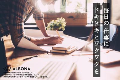 第二新卒の方を募集しています。 WEBマーケティングで圧倒的に成長できる環境を提供します! 例えば… 未経験から参画半年で月間3000万円の広告予算を1人で運用 インターン参加初日から仕事を完全に1人で担当 総フォロワー20万人のSNSアカウントの運用 もちろん、そのためのサポート体制は万全です◎ 業界未経験でもどんどん挑戦できます! 「失敗は絶対に怒らない」という方針で 果敢に仕事できるのが当社の売りです。 株式会社ALBONAでは1人1人が圧倒的な裁量で どんどん事業に挑戦しています。 普通の会社では挑戦できないような圧倒的な成長機会を バシバシ提供できるので、5年後10年後に周りと比べて 圧倒的に成長したい方はご応募ください!