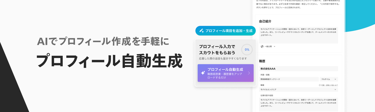 Wantedly, Inc. 1日前 フォロー 角田 久美 他4人 新機能「プロフィール自動生成」をリリースしました プロフィール作成をもっと手軽にたったの4ステップでプロフィールが完成①プロフィールページ内の専用ボタンをクリック②履歴書もしくは職務経歴書をアップロードする③プレビュー画面で内容を確認、編集④プ... もっと見る