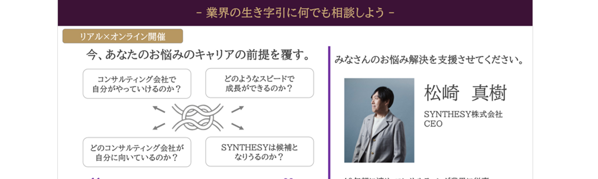 Synthesy株式会社 29日前 フォロー Akihiko Okada 【2/26(木)19:00開催】コンサル志望者の為のコンサル会社の選び方・サバイバルのコツ 【第1回 Career Strategy Seminar 】コンサル志望者の為のコンサル会社の選び方・サバイバルのコツ~コンサルタント/エンジニアとして市場価値を高めていくためのキャリア戦略~さ... もっと見る