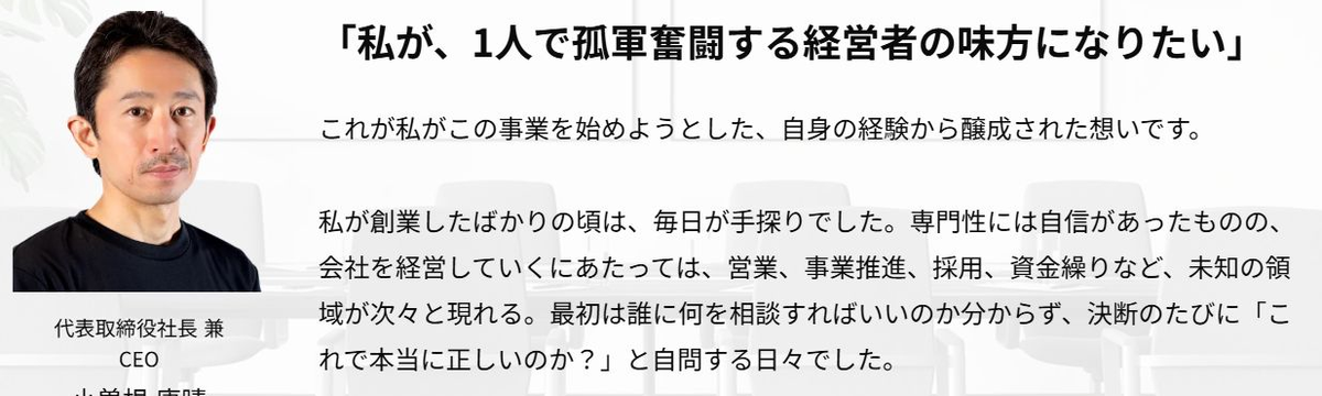 小曽根 康晴 6ヶ月前 フォロー 社員には言えないことがある。 社員には言えないことがある。.──「COO代行サービス」を立ち上げました。.経営って、孤独ですよね。.社員には言えないことがある。取締役にも相談しにくい局面がある。顧客の前では常に冷静でいなけれ... もっと見る