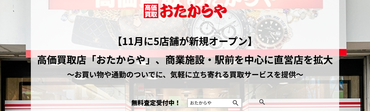 株式会社いーふらん 13日前 フォロー 広報 担当 【11月に5店舗が新規オープン】高価買取「おたからや」、商業施設・駅前を中心に直営店の新店舗を拡大〜お買い物や通勤... 株式会社いーふらん(本社:神奈川県横浜市、代表取締役社長:鹿村大志)は、全国で展開する高価買取おたからやにおいて、2025年11月に新たに5店舗をオープンしたことをお知らせいたします。おたからや... もっと見る