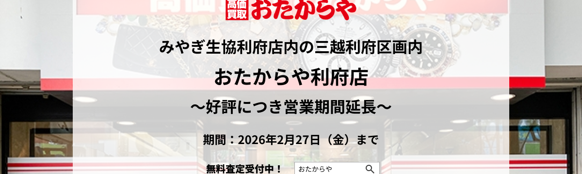 株式会社いーふらん 17日前 フォロー 広報 担当 【いーふらん】みやぎ生協利府店内・三越利府区画の「おたからや利府店」好評につき営業期間を延長 株式会社いーふらん(本社:神奈川県横浜市、代表取締役社長 鹿村大志、以下いーふらん)は、いーふらんが展開する「おたからや」事業において、2025年10月6日(月)より、みやぎ生協利府店内の三越利... もっと見る