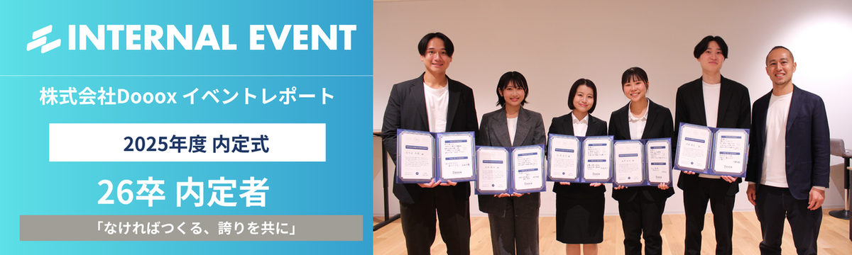 株式会社Dooox 7日前 フォロー 齊藤 志歩 Dooox25年度内定式:「なければつくる、誇りをともに」これがDoooxの流儀。 先日、2026年卒となる新たな仲間たちを迎える、内定式を開催しました。 しかし、私たちが目指したのは、世間一般の内定式とは一味違う、Doooxならではの未来へのキックオフです。 「内定式」と聞い... もっと見る