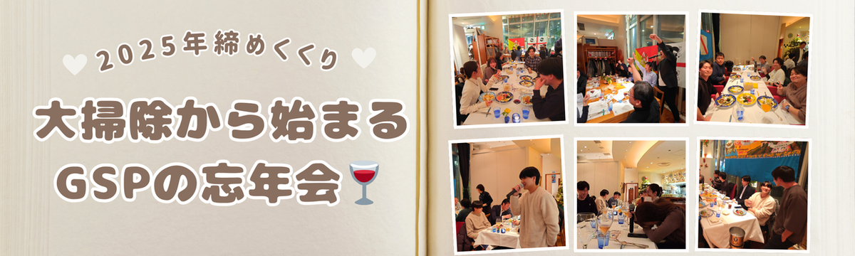 社内イベント 約3時間前 フォロー GSP おがさわら 2025年の締めくくり。大掃除から始まるGSPの忘年会🍷 2025年の仕事納めに行った、毎年恒例の忘年会の様子をご紹介します。年内最後の社内イベントとして、今年も16時から大掃除でスタートしました。普段なかなか手が回らない場所まで、みんなで一斉に掃除。... もっと見る
