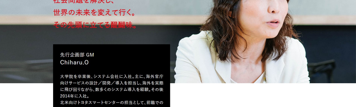 トヨタコネクティッド株式会社 5年弱前 フォロー 大内 瞳 他2人 【INTER VIEW!】TCの人々:さまざまな社会問題を解決し、世界の未来を変えて行く。 TCから新しいサービスを発信、かたちにしていく最近、耳にすることが多くなった「MaaS(Mobility as a Service)」。ICTの活用で交通をクラウド化し、マイカー以外のすべての交... もっと見る