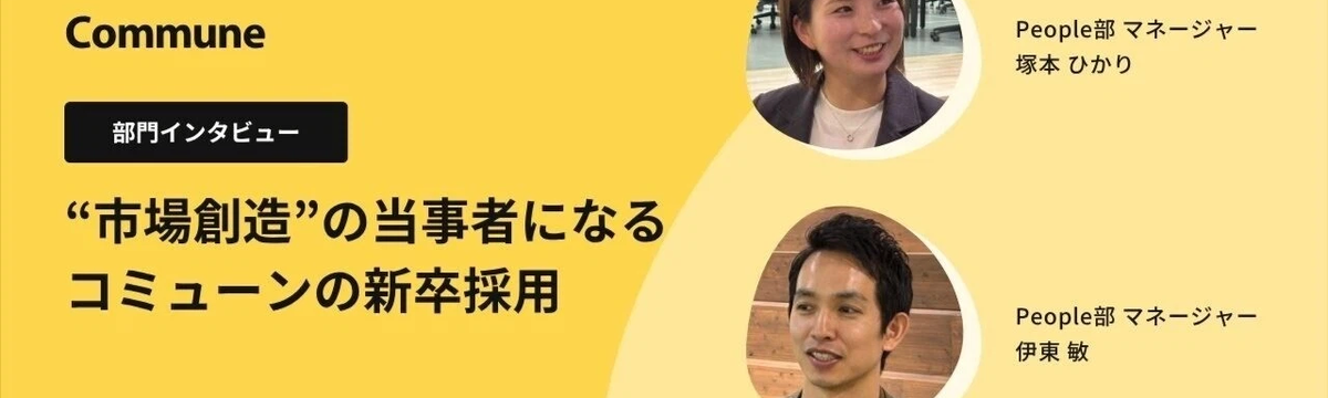 コミューン株式会社 約2ヶ月前 フォロー コミューン 株式会社 “市場創造”の当事者になる 人事マネージャーが語るコミューンの新卒採用 コミューンでは現在、中途採用だけではなく新卒採用にも力をいれるようになりました。「この会社で成長したい」。就職活動で多くの学生の方がその言葉を口にします。しかし、その言葉の裏にある「本当の成長」... もっと見る