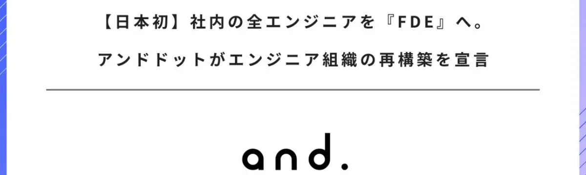株式会社グロースリンク 約17時間前 フォロー 採用担当 木村 弊社提携企業であるAI企業のand.社の記事をご紹介いたします! 弊社が業務提携を結んでいる、and.(アンドドット)社のエンジニアさんに関する記事をご紹介いたします。全エンジニアを「価値創出型」へ――FDEへの転換を発表アンドドット株式会社は、全エンジニアを... もっと見る