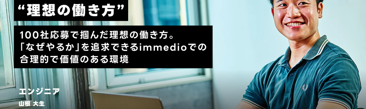 株式会社immedio 約1ヶ月前 フォロー 木下 眞由子 100社応募で掴んだ理想の働き方。「なぜやるか」を追求できるimmedioでの合理的で価値のある環境 山根 大生/エンジニア広島の大学で情報科学を専攻。新卒でSIer、その後事業会社のエンジニアを経験。フルリモートかつ東京のスタートアップで働くことを目指し、転職活動を経てimmedioに入社。現... もっと見る