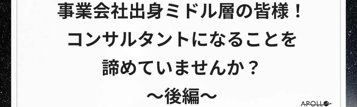 APOLLO Consultant Blog 約3年前 フォロー 林 正浩 事業会社出身ミドル層の皆様!コンサルタントになることを諦めていませんか?~後編~ アポロのコンサルティングユニットでマネージャーをしている、林です。前編では、事業経験しか経験したことない私が、40代後半にしてついに憧れの「コンサルタント」になることができた経緯についてお話しま... もっと見る