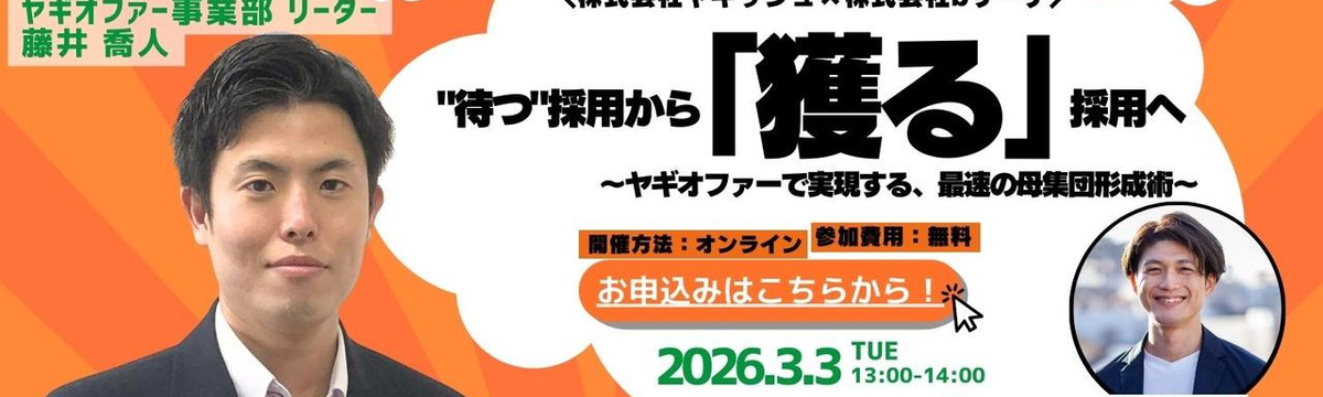 株式会社bサーチ 7日前 フォロー 株式会社 bサーチ 【共催セミナー】ヤギオファーで実現する“待つ”から「獲る」採用へ 【2026年最新】「待つ採用」の限界を突破する…!?最速で優秀な人材を確保するための「獲る」採用戦略・徹底解説セミナーです。「求人媒体に出しても応募が来ない」「ターゲット層からの反応が薄い」……... もっと見る
