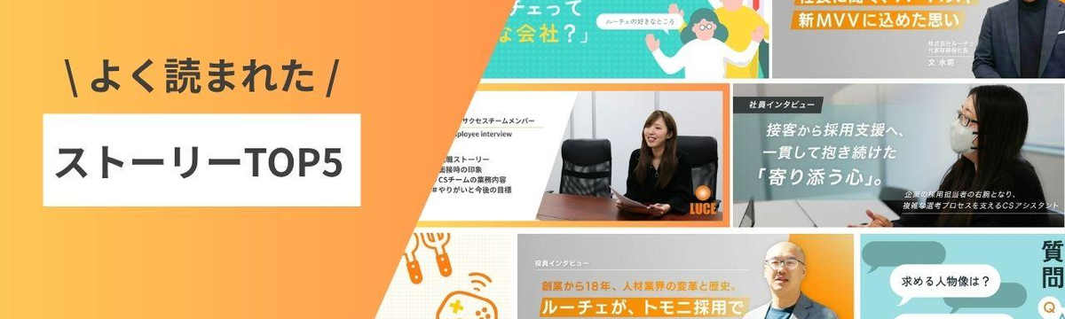 株式会社ルーチェ 4日前 フォロー 遠藤 実花子 【2026年4月版】累計PV数ランキングTOP5!よく読まれたストーリーをまとめました。 こんにちは!株式会社ルーチェ採用担当です。今回は、これまでに公開してきたストーリー45本の中から、2026年4月時点で多くの方に読まれた「累計PVランキングTOP5」をご紹介します!「まだポジシ... もっと見る