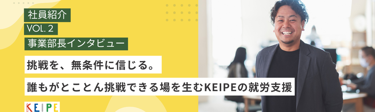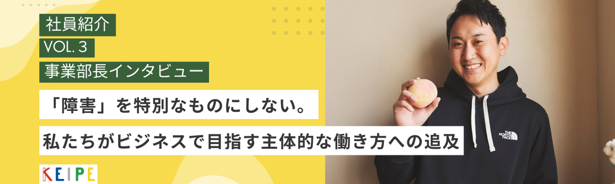 KEIPeople 10ヶ月前 フォロー 後藤 大地 【事業部長インタビュー】障がいを特別なものにしないーKEIPEのビジネスで目指す主体的な働き方 みなさんこんにちは!25卒内定者、後藤です。KEIPE株式会社に興味をお持ちいただきありがとうございます。私たちは「障がいを特別なものにせず、誰もがそこに居ていい社会」を目指して事業を展開してい... もっと見る