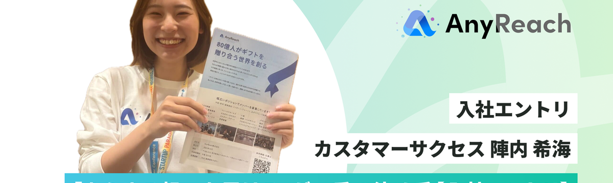 AnyReach株式会社 約2ヶ月前 フォロー 渡辺 真梨奈 「あらゆる想いを届ける」が一番の決め手【入社エントリ】 初めまして、のんです。AnyReachに入社して1ヶ月と半分のこのタイミングで入社エントリを書かせてもらえてハピネスです。入社してまだ1ヶ月半の人間ではありますが、もうどっぷりギフトの素晴らしさ... もっと見る
