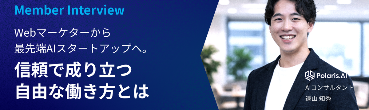 Polaris.AI株式会社 約1ヶ月前 フォロー 田所 優卯 他1人 Webマーケターから最先端AIスタートアップへ。信頼で成り立つ自由な働き方とは 経営の道を目指してマーケティングの世界へ――遠山さんは、幼い頃から少し変わった環境で育たれたとお聞きしました。遠山: そうですね。父が会社を経営していたので、物心のついた時から「経営者としての視... もっと見る
