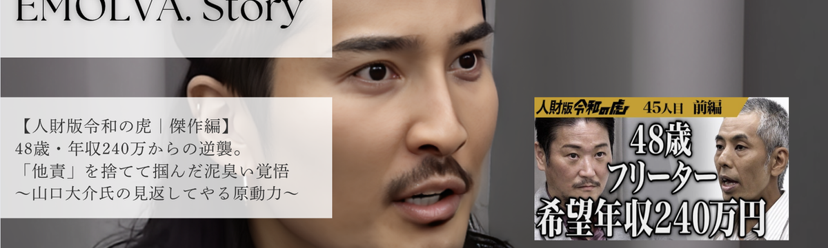 株式会社EMOLVA 9日前 フォロー 本村 稜 【人財版令和の虎|傑作編】48歳・年収240万からの逆襲。「他責」を捨てて掴んだ泥臭い覚悟〜山口大介氏の「見返して... 「人財版令和の虎」主宰の榊󠄀原清一です。「人財版令和の虎」は、志願者が自らのキャリアを切り開くために、虎たる経営者たちに挑む真剣勝負の場です。この番組の核心は、決して「魔法」ではありません。自分... もっと見る