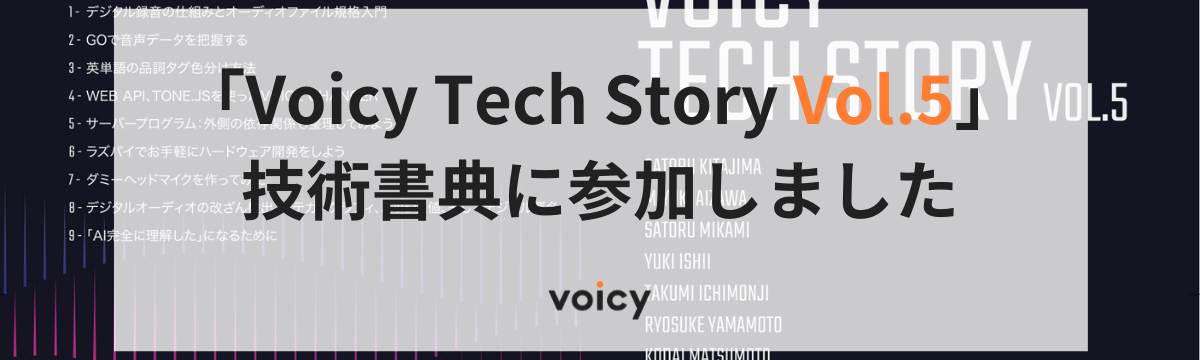 株式会社Voicy 2年以上前 フォロー 高森 はるな 他7人 「Voicy Tech Story Vol.5」技術書典に参加しました こんにちは。Voicyカンパニークリエイターの “はる” こと高森はるなです。先日、技術書典14にて、Voicyが「Voicy Tech Story Vol.5」を頒布。技術書制作のウラガワを取... もっと見る