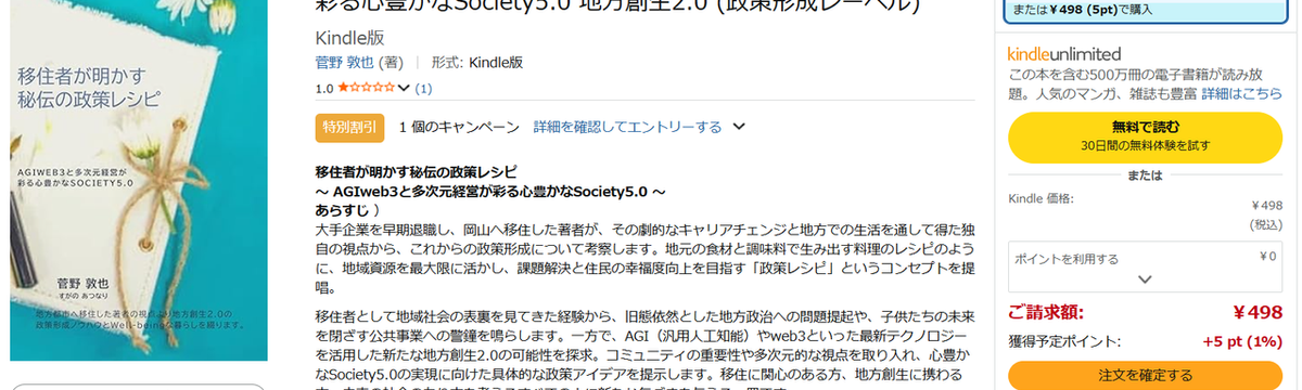 菅野 敦也 6日前 フォロー 【 マイ出版物 】Kindle版 移住者が明かす秘伝の政策レシピ 【 出版ご報告 】 移住者が明かす秘伝の政策レシピ: AGIweb3と多次元経営が彩る心豊かなSociety5.0 地方創生2.0 (政策形成レーベル) Kindle版 菅野 敦也 (著) お時... もっと見る