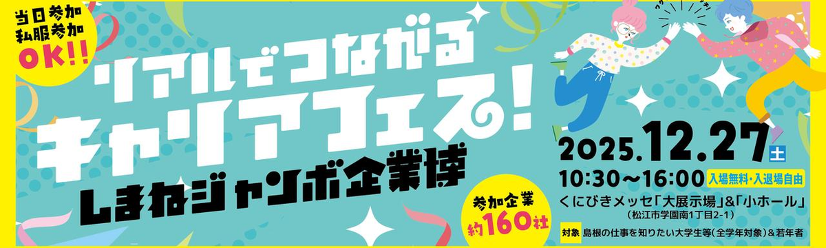 株式会社ユニオンシンク 1日前 フォロー 濵野 充 12/27(土)「しまねジャンボ企業博」に参加します。 こんにちは。広報室の濵野です。株式会社ユニオンシンクは12月27日(土)、島根県松江市の「くにびきメッセ」にて開催される「リアルでつながるキャリアフェス!しまねジャンボ企業博」に参加いたします。... もっと見る