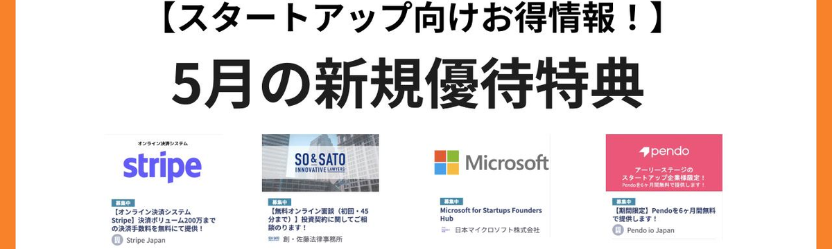 スマートラウンド 3年以上前 フォロー 冨田 阿里 【5月の新規優待特典】スタートアップ向けお得情報! こんにちは!スマートラウンドの大地です。スタートアップのみなさまにお得な情報を掲載している優待特典を10件ご紹介いたします!各種サービス利用料の特典や、士業の方への無料相談、アクセラレータープロ... もっと見る