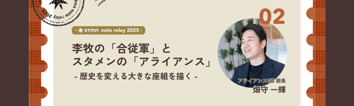 ビジネス職 約20時間前 フォロー 久保田 桃加 他1人 李牧の「合従軍」とスタメンの「アライアンス」:歴史を変える大きな座組を描く スタメンでは、12月1日〜25日まで note relay 2025 を実施しています🎄今回はその企画の中で投稿されている記事を転載します。スタメンの人や組織、事業など、リアルが詰まっている内容... もっと見る