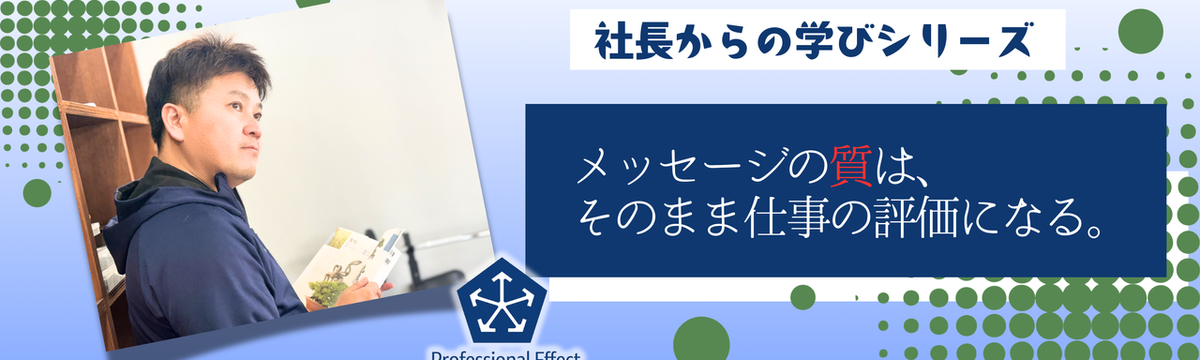 株式会社プロフェッショナルエフェクト 20日前 フォロー 岡田 みゆき 「まあ、これでいいか」で送ったメッセージは、だいたい失敗する。【社長からの学び】 みなさま、どうも!プロフェッショナルエフェクトの採用&広報担当、オカダです!ご訪問ありがとうございます!😊💕本日は、普段の社長とのお話から得たちょっとした学びをご紹介する、「社長からの学び」シリ... もっと見る