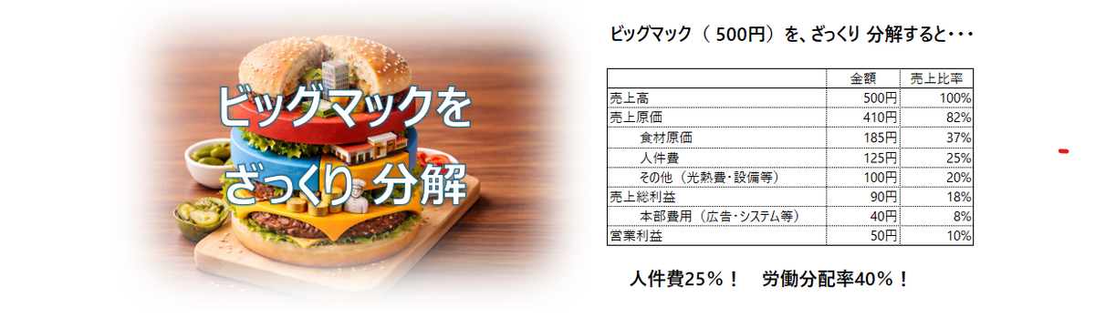 望月 信輔 29日前 フォロー ビッグマック500円から考える「人件費」と生産性 春闘賃上げが5%~6%というニュースを見かけます。2月に値上げしたマクドナルドの「ビッグマック(500円)」を分解して人件費視点でざっくり見てみたいと思います。営業利益は1個当たり10%(50円... もっと見る