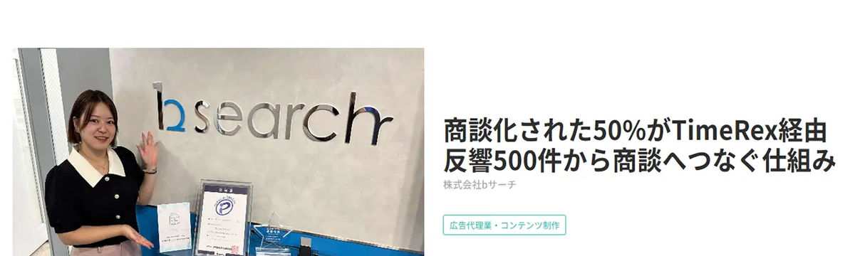 株式会社bサーチ 4日前 フォロー 株式会社 bサーチ 【TimeRex記事にてbサーチが紹介されました!】 TimeRexや調整さんなどの日程調整ツールを運用するミクステンド株式会社様の記事で、bサーチが紹介されました。【TimeRexとは】ビジネスの予約やアポの日程調整を自動化する日程調整ツールです... もっと見る