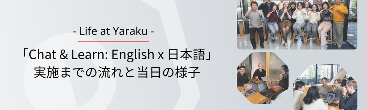 Yaraku,Inc.(八楽株式会社) 11ヶ月前 フォロー Rina Watanabe 社員同士で言語を学び合う言語交換会「Chat & Learn: English x 日本語」を実施しました! こんにちは!八楽で人事・総務チームの社内広報/リンギストとして働いている渡邉です。先日当チーム主催で言語を学び合う会を実施しました。この記事では、企画の経緯から当日の様子までをざっくりお伝えした... もっと見る