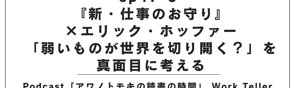 粟野 友樹 約3時間前 フォロー Podcast「アワノトモキの読書の時間」 Work Teller ep47-5 『新・仕事のお守り』×エリック・... Podcast『アワノトモキの読書の時間』 Work Teller ep47-5一冊の小さな本を枕にして、遠く離れたひとりの労働者の人生へと、そっと思いを伸ばしていく――。このエピソードは、そん... もっと見る