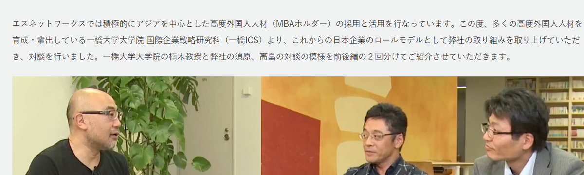 エスネットワークス 6年弱前 フォロー Yamamoto C 一橋ICS 楠木教授との対談:エスネットワークスの高度外国人人材採用と活用とは? 前編 こんにちは!エスネットワークスの山本です。以前より弊社HPで公開させていただいている一橋ICS 楠木先生との対談記事を改めて掲載させていただきます。グローバル化における弊社の考え等をご確認いただ... もっと見る