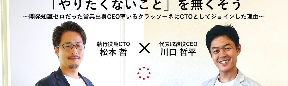 クルーの紹介 -エンジニア- 約5年前 フォロー 山際 有香 他2人 【CTO松本×CEO川口】入社時対談インタビュー「やりたくないこと」を無くそう~開発知識ゼロだった営業出身CEO率... CEO川口です。この度、2020年9月1日よりクラッソーネのCTO(最高技術責任者)に松本哲氏が就任しました。(プレスリリースはこちら)就任に至る経緯や今後の展望をCTO松本氏と語り合いました。... もっと見る