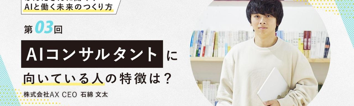 株式会社AX 3ヶ月前 フォロー Alice Takeuchi 【第3回】代表・ぶんたさんに聞く!AIと働く未来のつくり方〜AIコンサルタントに向いている人の特徴は?〜 こんにちは!法人向けAI研修・伴走支援を行う株式会社AX(エーエックス)です。連載第3回となる今回は、AXで実際に活躍しているメンバーの共通点から見えてきた「AIコンサルタントに向いている人」の... もっと見る