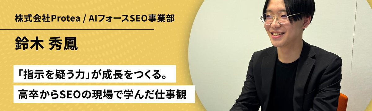 社員インタビュー 約7時間前 フォロー 篠塚 歩美 他1人 【社員インタビュー Vol.6】「指示を疑う力」が成長をつくる。高卒からSEOの現場で学んだ仕事観 こんにちは!株式会社Protea バックオフィス担当の篠塚です!今回は、2025年4月に入社したAIフォースSEO事業部で活躍する鈴木秀鳳さんにお話を聞きました。高校卒業後すぐにProteaへ入... もっと見る