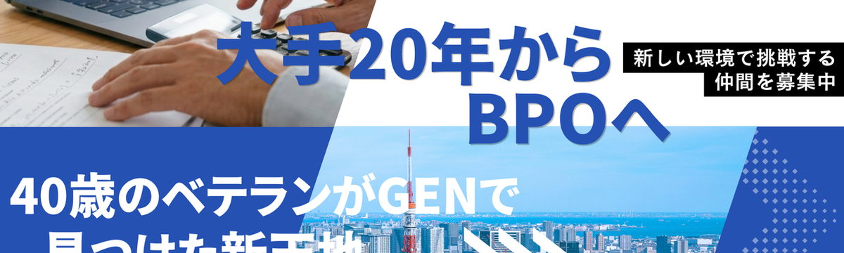 株式会社GEN 2日前 フォロー 佐藤 久美 大手20年からBPOへ。40歳のベテランがGENで見つけた新天地 大手企業でキャリアを積み上げ、経理として熟練の域に達したT.Y.さん。安定した環境に身を置きながらも、彼が40歳という節目で選んだのは、スタートアップや中小企業のバックオフィスを劇的に変える「G... もっと見る