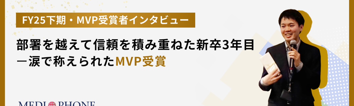 メディフォン株式会社 18日前 フォロー 大和 菜月 部署を越えて信頼を積み重ねた新卒3年目ー涙で称えられたMVP受賞【FY25下期・MVP受賞者インタビュー】 医療×DXで社会課題に挑むメディフォン。2025年11月に行われたFY25下半期のアワードでMVPに選ばれたのは、CEO室・新規事業開発グループと医療支援部・セールスグループを兼務し、営業として... もっと見る