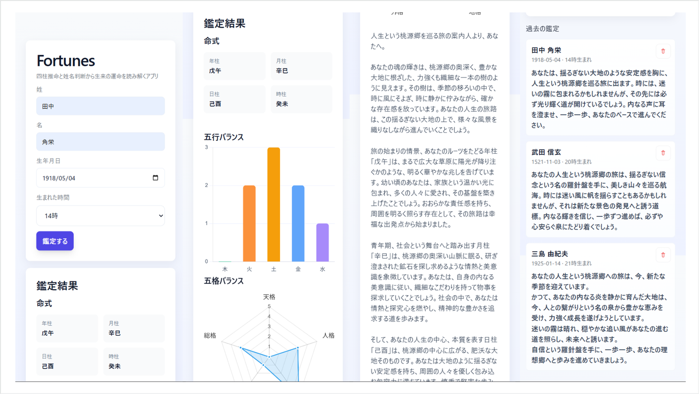 - 出力:命式、五行、五格。その情報をもとにAIが総合鑑定文を作成