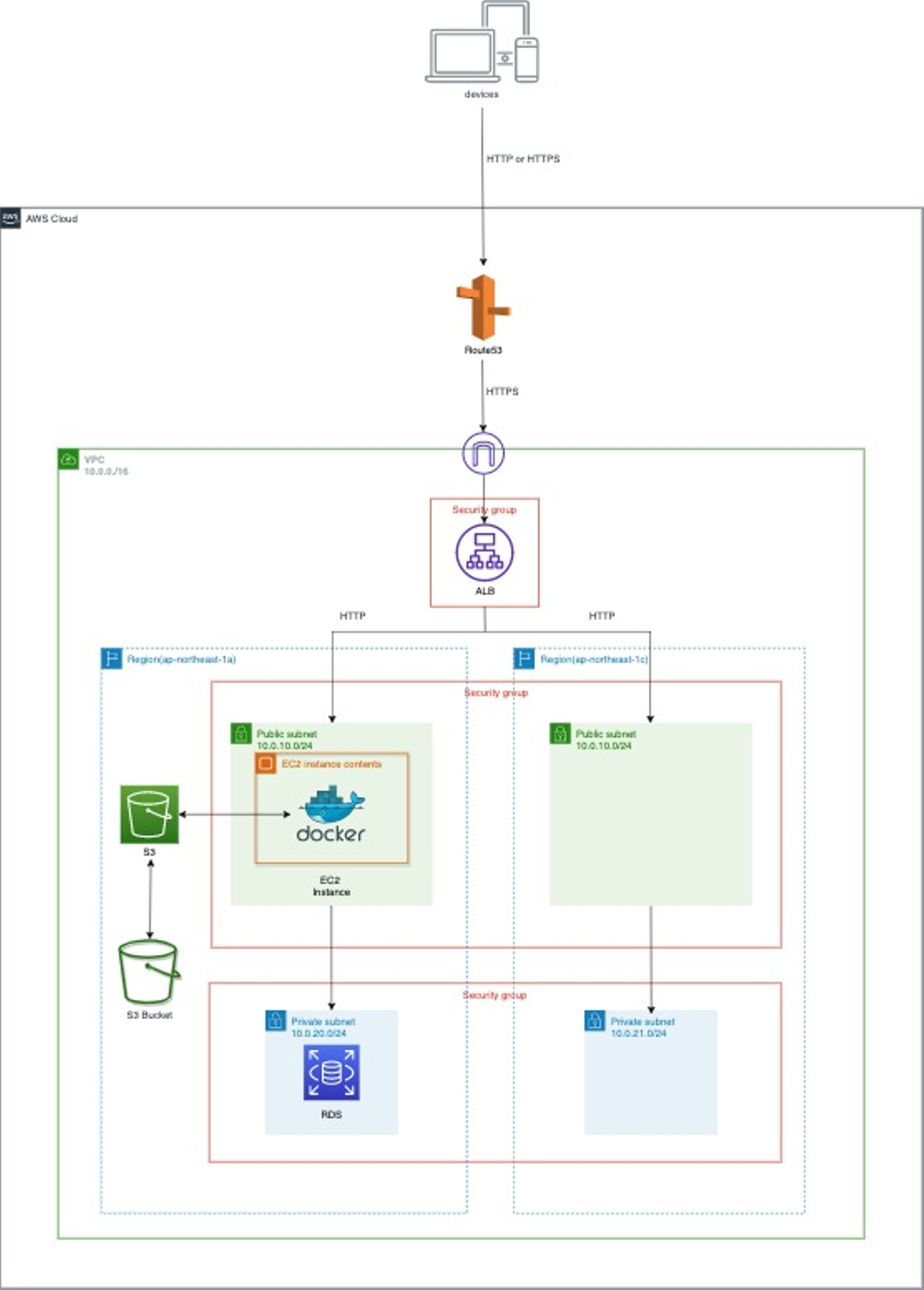AWS(VPC, EC2, IAM, RDS, InternetGataway, SecurityGroup, Subnet, Route53, ALB, ACM, S3, CloudFront)