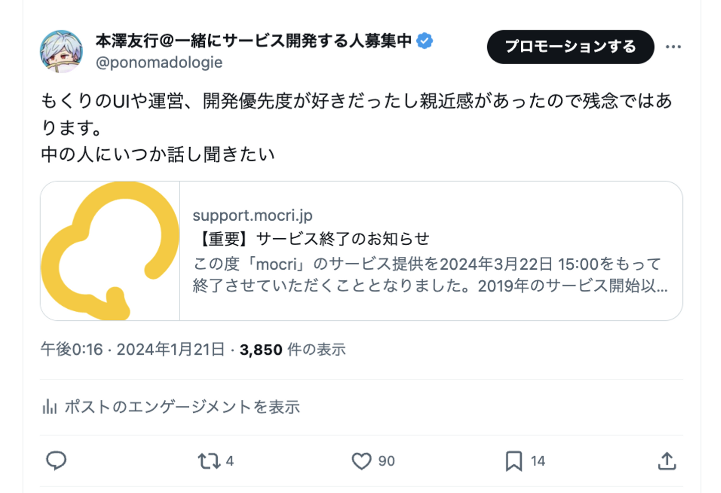 もくりのUIや運営、開発優先度が好きだったし親近感があったので残念ではあります。中の人で熱量のあるコミュニケーションサービスやりたい方、いずれ一緒にサービスやりたいので、会話できたらうれしいです(今すぐ転職とかじゃなくていい)