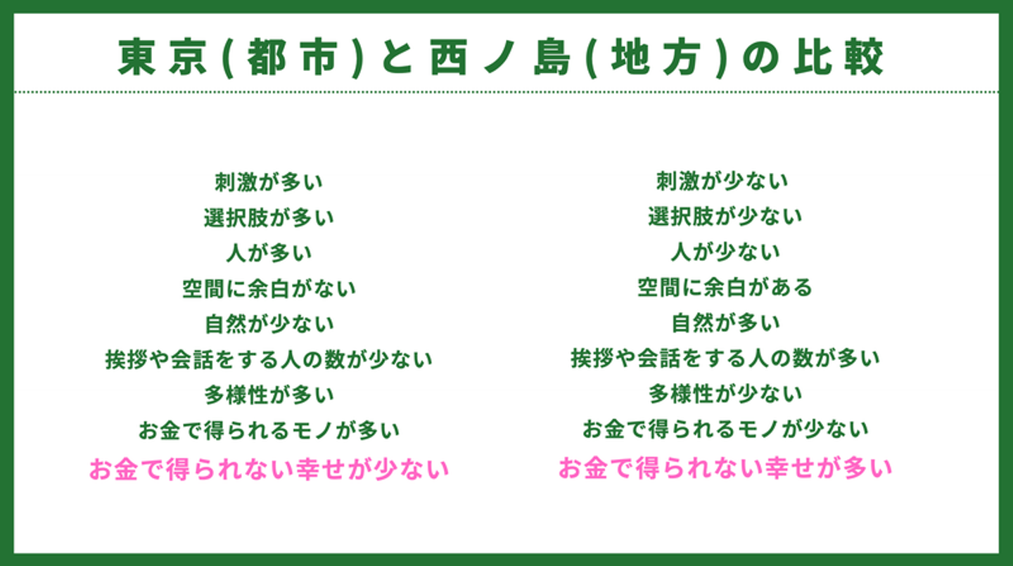 僕は今回、東京(都市)から西ノ島(地方)に移動して、暮らしてみて、この2つを多様な角度から比較することができました。