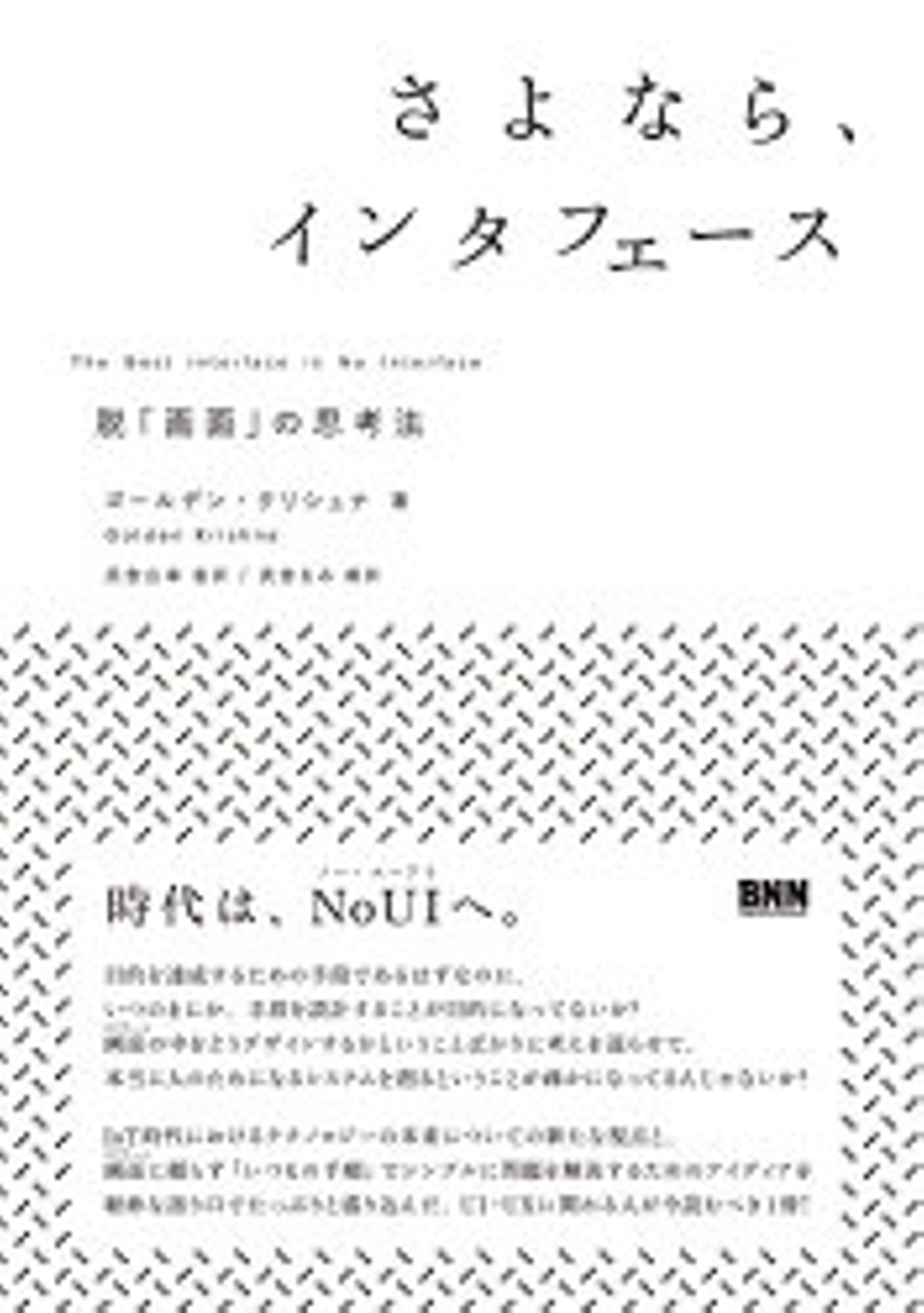 UIデザインについての本ということでまとめていたが、あえてこの本を最後に紹介する。表紙にもあるが「時代は、NoUI(ノーユーアイ)へ」ということで、本当の目的を達成するために、いつの間にかなんでも画面で表現しようとしていないか、それは目的と手段を履き違えているのではないかという問いかけ。「ベストなインターフェイスは、ノー・インターフェイス(No UI)」
