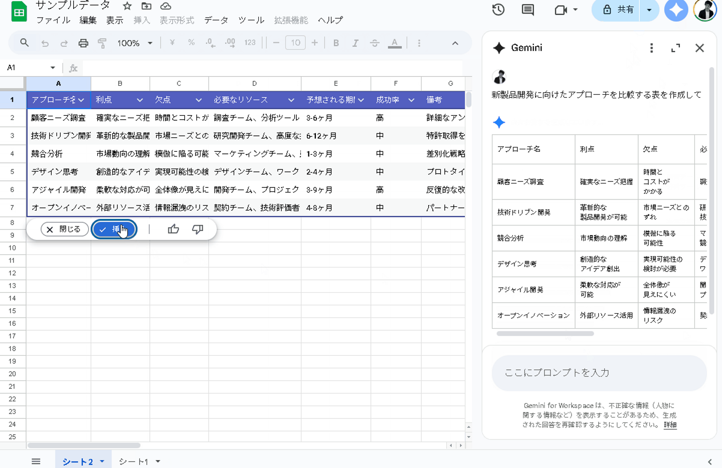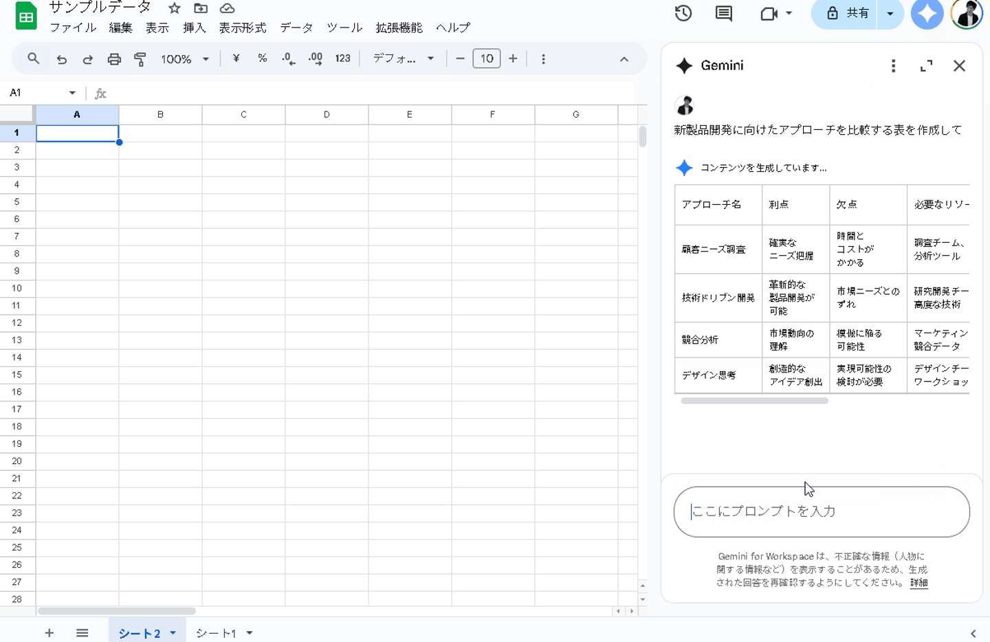 SpreadSheet & Gemini Eguchi Yuuki 一般 on 2025/04/14 SpreadSheet & Gemini「新製品開発に向けたアプローチを比較する表を作成して」一瞬で作成…改めて凄すぎる…。#Gemini SpreadSheet & Gemini Eguchi Yuuki 開発 Gemini シェア
