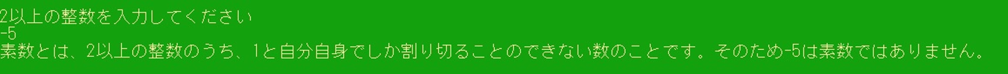 1以下の数字を入力すると、素数の定義から説明されたのち、素数でないと言われます。