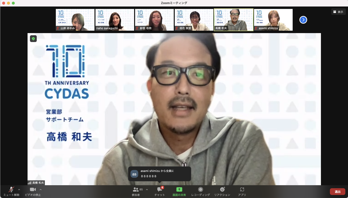さてさて。お酒もしっかり回り、チャット欄も大盛り上がりで、宴もたけなわではございますが…、日も暮れてきたので、そろそろ閉会です。閉会の挨拶は、新しく役員に就任された、営業部の和夫さんから。「ここにいる仲間だけでなく、お客様も、退職した人も、いろんな人の積み重ねがあってこの10年があります。思いを受け継いで、次の10年の歴史を作っていこう」という熱いメッセージに、みんなジーン。。。