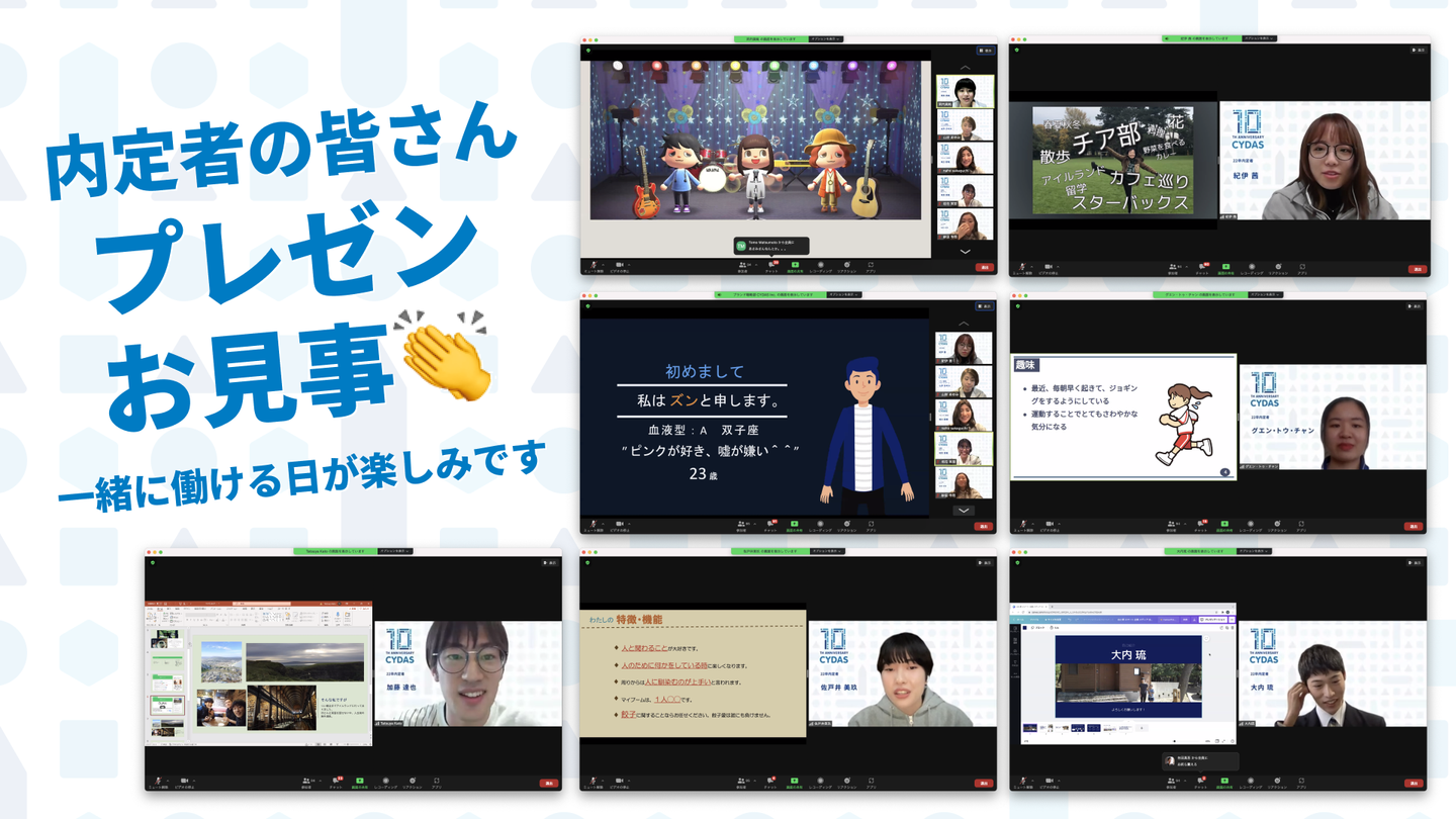 そして…、サプライズコンテンツが、ここでお披露目!なんと、サイダスの「社歌」ができました!これは、21卒で音楽が得意なさりちゃんが作詞・作曲を手がけたものです。大学時代に活動していたアカペラサークル仲間の皆さんも協力してくださり、動画の形でお披露目されました。チャット欄も大盛り上がりで、社員のリアクションは上々でした♪