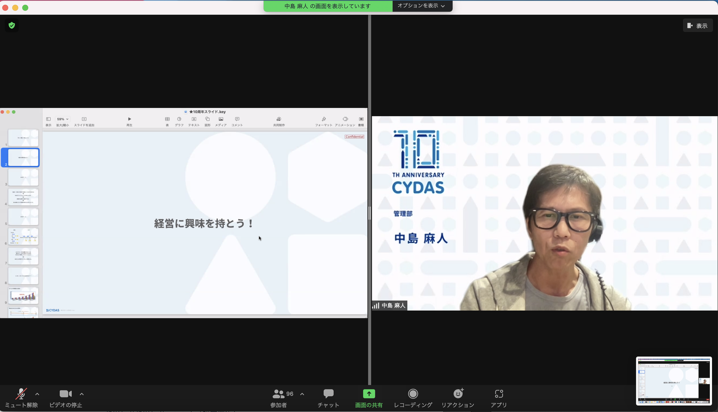 CTOである吉田さんからは、中期経営計画の話。「サイダスは、これからどんどん成長していきます!」ブランド戦略部部長のあさみさんからは、新しい評価制度の共有がされました。「皆さんの才能を発揮できるように、前向きに取り組んでいきましょう!」CFOである中島さんからは、ちょっとホロリとしながらも経営に突っ込んだお話も。「経営に興味を持とう」のメッセージ、刺さりました。