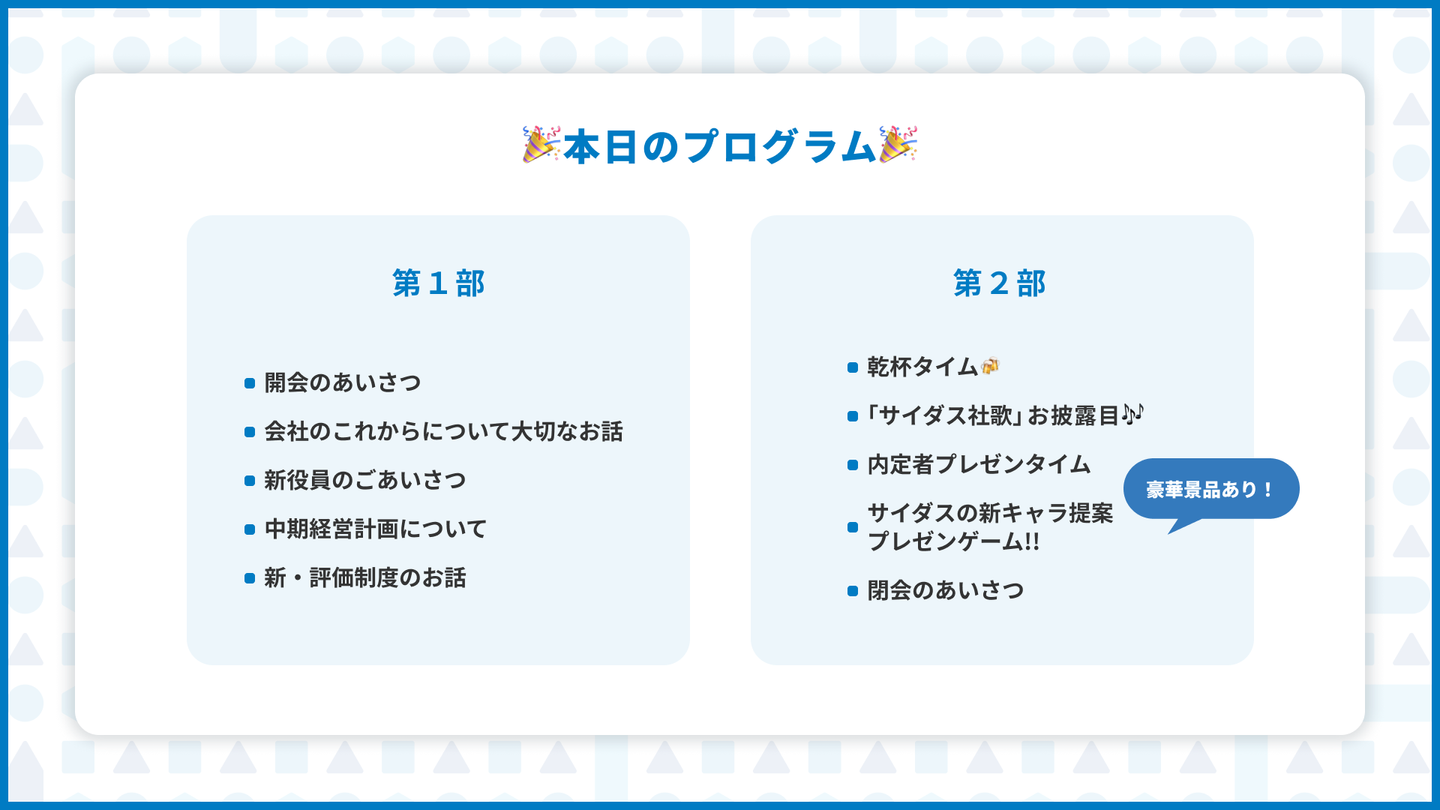 イベントのプログラムはこんな感じでした。前半の第一部は、真面目な雰囲気で始まり、主に役員陣からのお話をいただきました。