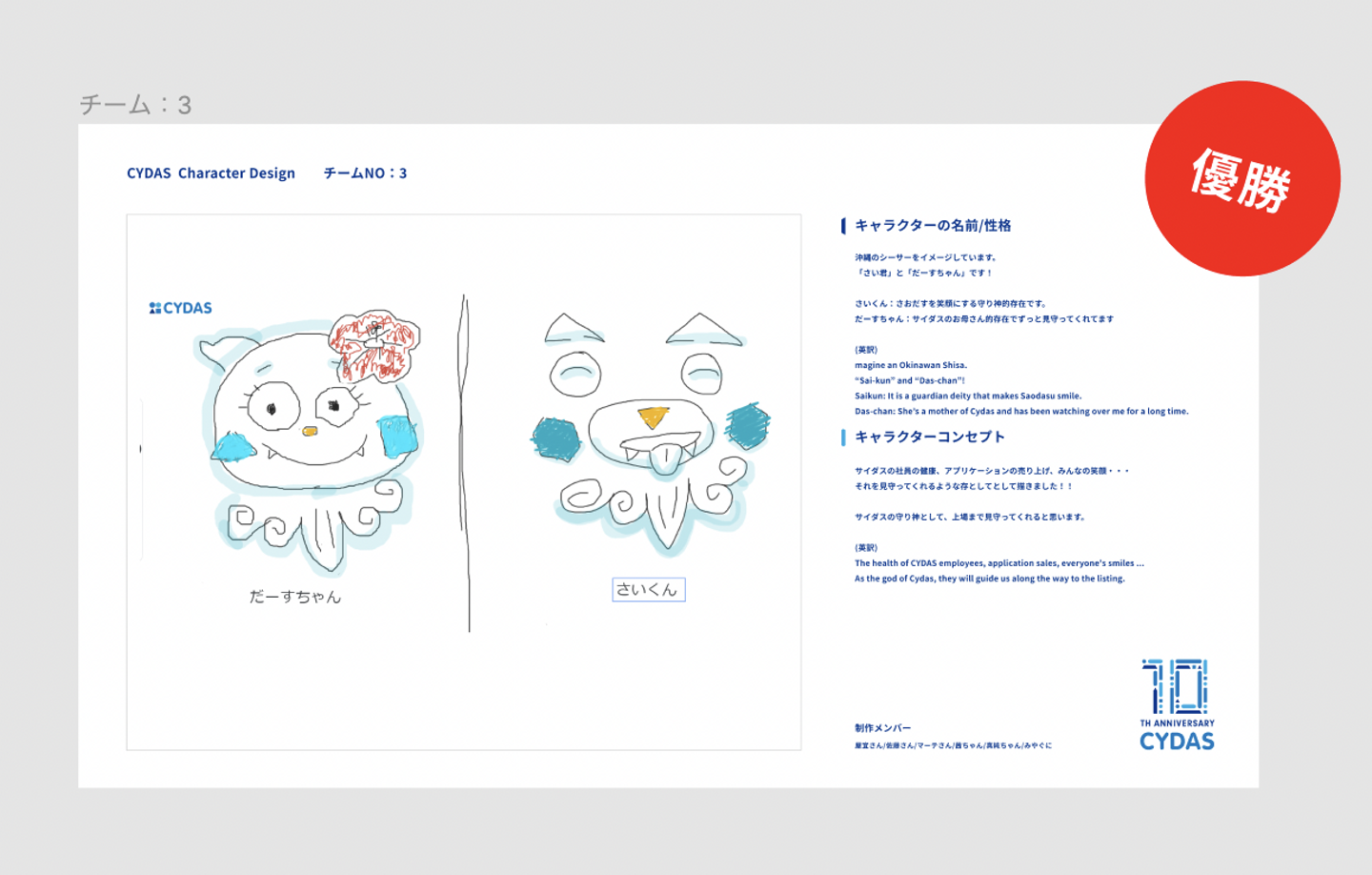 そして……優勝したのは!こちらのチームでした。このチームには22卒メンバーがいて、そのメンバーが絵を描いたりなど活躍してくれたそうです!その様子に社員は胸が熱くなって投票したとか…?