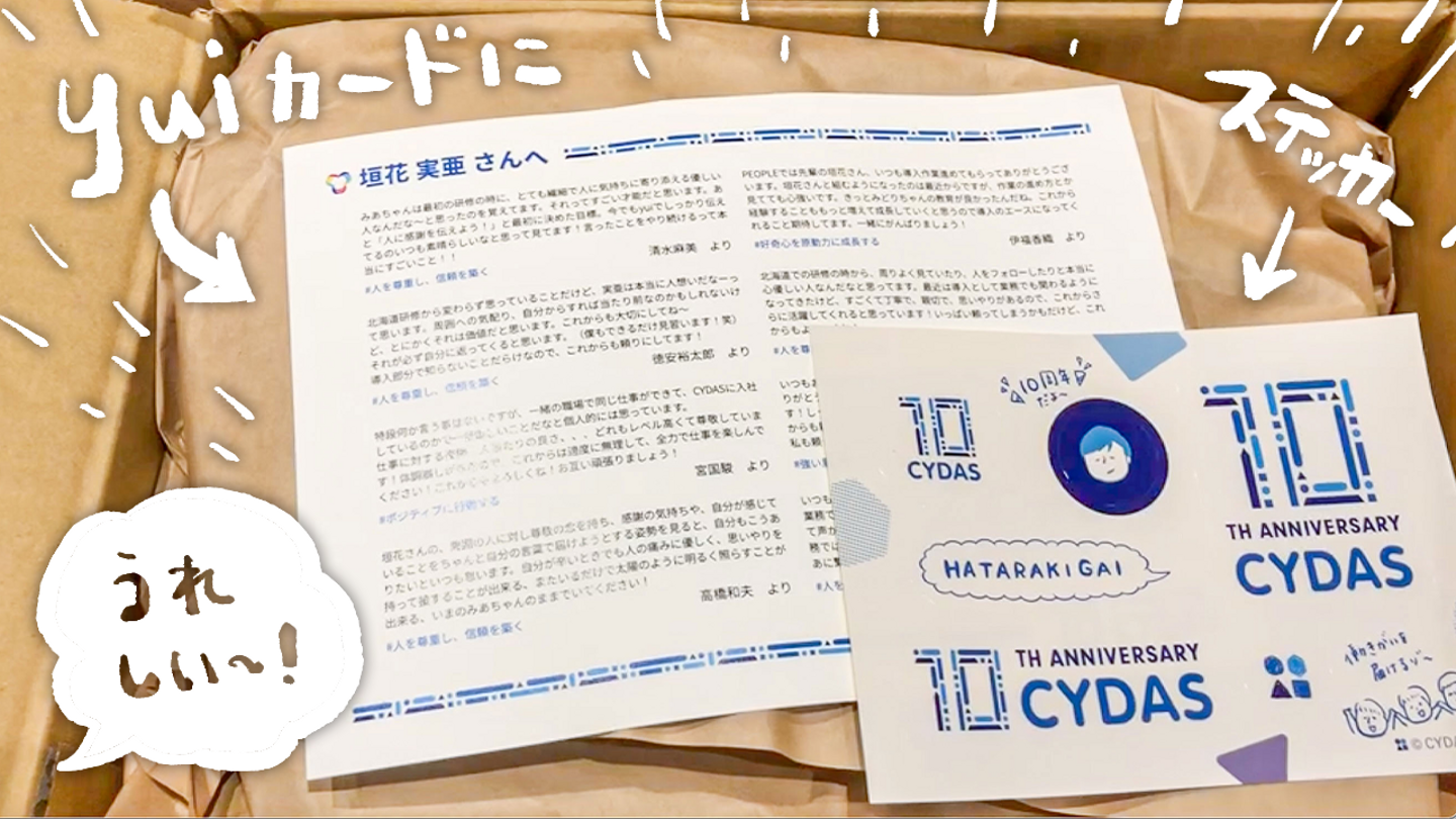 yuiカードとは、社員から社員への感謝の気持ちを集めて記載したメッセージカードです。サイダスの製品のひとつであり、お互いに感謝を伝えてエンゲージメントを高めるためのアプリケーション「yui」にちなんだ企画です。会社からのメッセージが書かれたお手紙とともに、感謝の気持ちを詰め込みました。